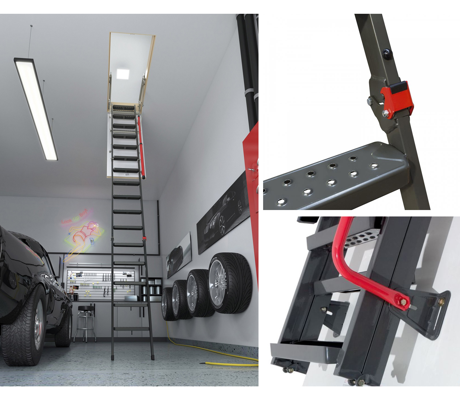 Складная чердачная лестница LMP состоит из марша и термоизоляционного люка. Металлическая лестница выдерживает повышенную нагрузку до 200 кг для безопасного подъема на чердак с вещами.