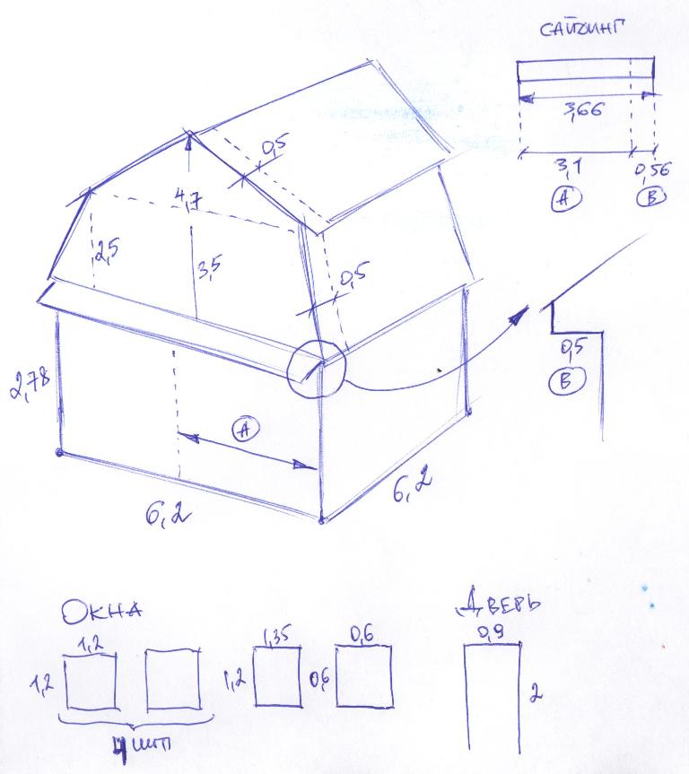 Для того чтобы правильно рассчитать количество элементов сайдинга и крепежного материала, нужно знать точные размеры дома, включая проемы. Размеры можно взять из проекта или сделать замер дома —периметр строения по линии цоколя и кровли, высоты по углам, а также периметр окони дверей.